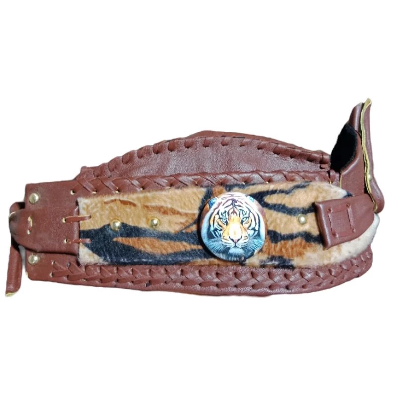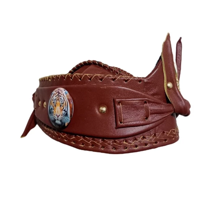 A handcrafted leather blangkon in rich brown, detailed with hand-stitched edges and a bold tiger